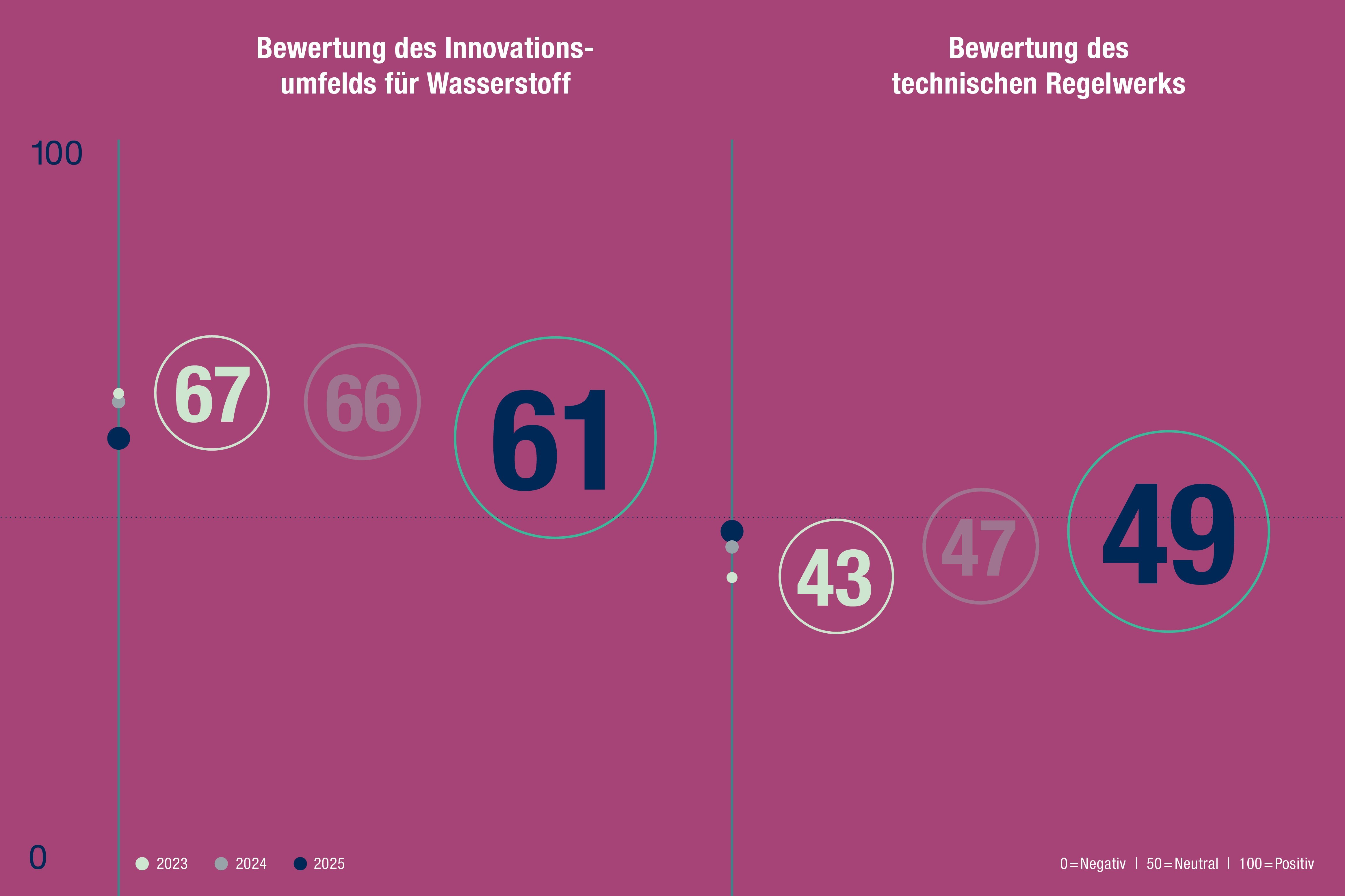 • Die Einschätzungen der Marktakteure bezüglich verschiedener Wasserstofftechnologien variieren nach wie vor. Die Entwicklung von Schlüsseltechnologien, wie z. B. Erzeugung und Transport, wird größtenteils von den Markakteuren als neutral mit positiver Tendenz bewertet. Der technische Stand der Wasserstofftechnologien zur Verflüssigung und im Gebäudesektor wird von den Befragten etwas schlechter eingestuft.